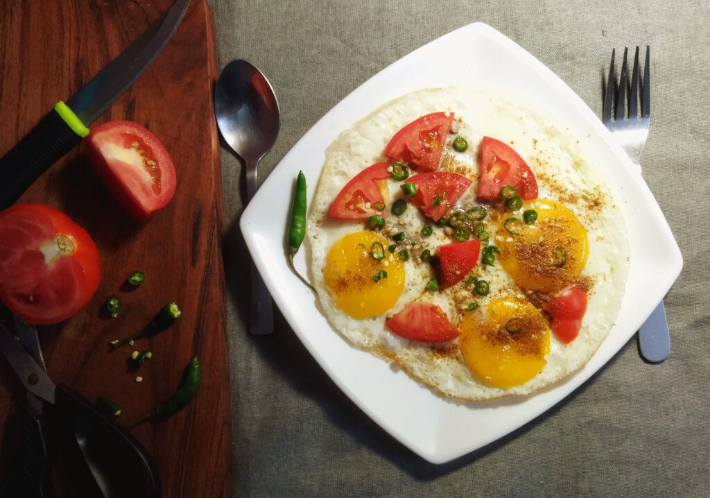 Sunny-Side Up Fried Eggs topped with tomatoes